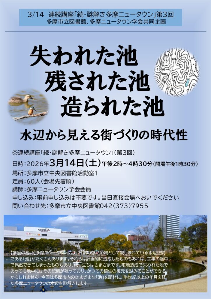 昨年度から多摩市立図書館との共同事業として始めた連続講座「続・謎解き多摩ニュータウン」の第3回を開催します。今回は多摩市内のさまざまな「池」をテーマにした興味深いリレートークとなります。